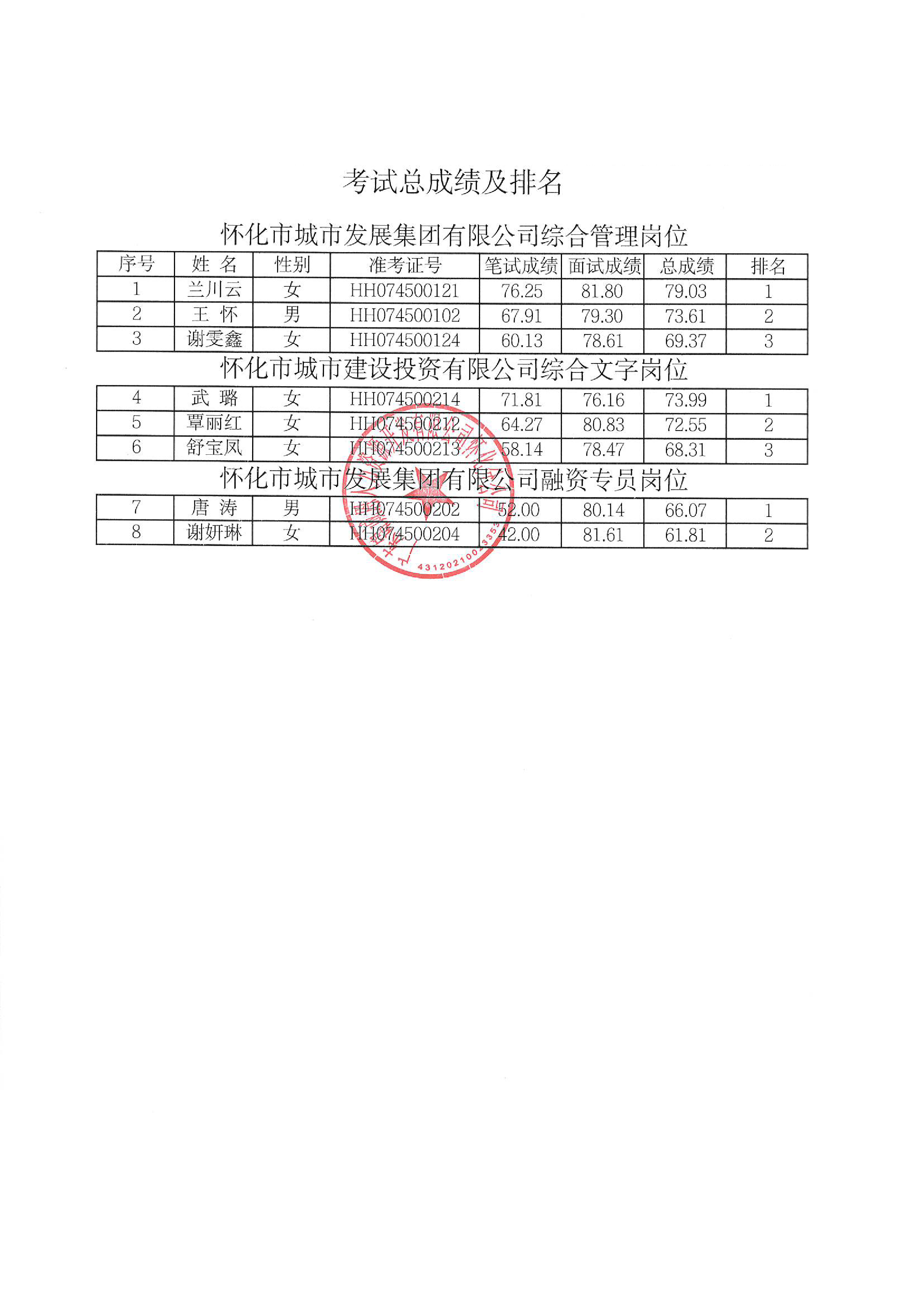 懷化市城市發(fā)展集團有限公司2023年校園招聘面試入圍考生考試總成績及排名
