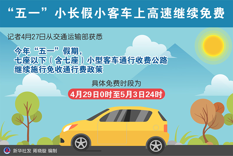 “五一”假期臨近。記者4月27日從交通運(yùn)輸部獲悉,2023年“五一”假期,七座以下(含七座)小型客車通行收費公路繼續(xù)施行免收通行費政策,具體免費時段為4月29日0時至5月3日24時。