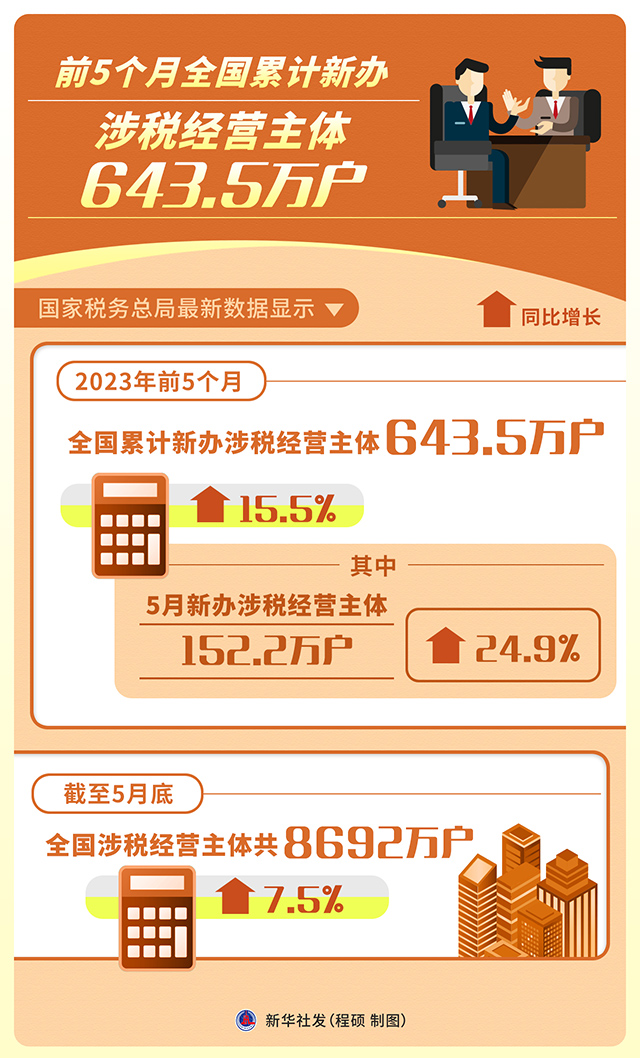 國家稅務總局最新數(shù)據(jù)顯示,2023年前5個月,全國累計新辦涉稅經營主體643.5萬戶,同比增長15.5%。其中,5月新辦涉稅經營主體152.2萬戶,同比增長24.9%。截至5月底,全國涉稅經營主體共8692萬戶,比去年同期增長7.5%。