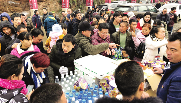 1月28日,洪江市組織工作人員在邵懷高速公路安江出口為被困乘客免費發(fā)放餅干、方便面和飲用水等食品。由于嚴寒低溫天氣,邵懷高速洪江市路段大面積結冰,安江出口20 余輛大巴車被困。該市立即調撥救援物資,幫助被困群眾。(楊錫建 向華 攝)