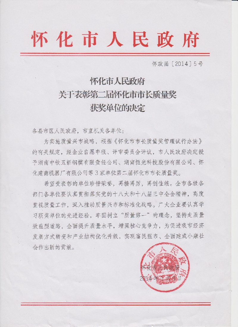 自2011年頒發(fā)首屆懷化市市長(zhǎng)質(zhì)量獎(jiǎng)以來,全市各級(jí)各部門,各企業(yè)迅速掀起了質(zhì)量興市熱潮,廣泛開展了學(xué)習(xí)貫徹落實(shí)以《卓越績(jī)效評(píng)審準(zhǔn)則》國(guó)家標(biāo)準(zhǔn)和市內(nèi)外先進(jìn)企業(yè)成功質(zhì)量管理經(jīng)驗(yàn)為重點(diǎn)的質(zhì)量強(qiáng)市活動(dòng),我市質(zhì)量工作得到了很好的發(fā)展,為進(jìn)一步推進(jìn)質(zhì)量興市戰(zhàn)略,2013年我市根據(jù)《懷化市市長(zhǎng)質(zhì)量獎(jiǎng)試行管理辦法》的有關(guān)規(guī)定,經(jīng)企業(yè)自愿申報(bào)、評(píng)審委員會(huì)評(píng)議,市人民政府決定,授予湖南中鐵五新鋼模有限責(zé)任公司、湖南恒光科技股份有限公司、懷化建南機(jī)器廠有限公司等3家單位第二屆懷化市市長(zhǎng)質(zhì)量獎(jiǎng)。