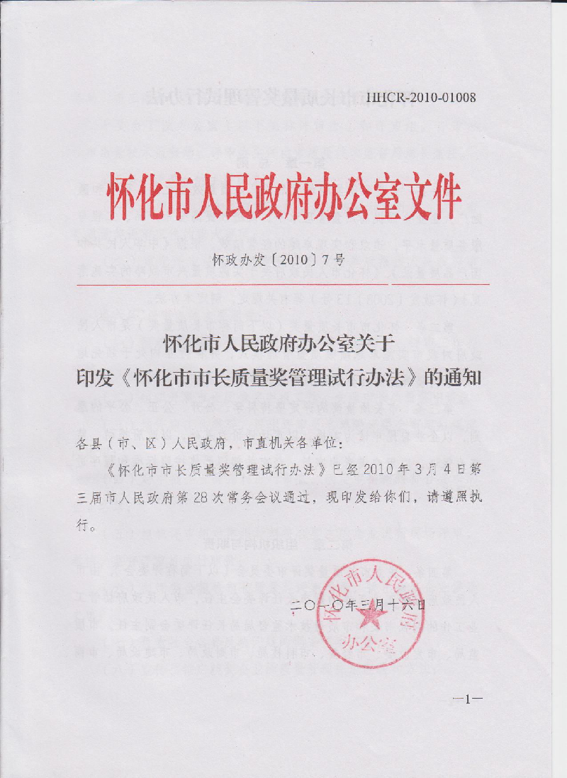 市政府辦關(guān)于印發(fā)《懷化市市長質(zhì)量獎管理試行辦法》的通知