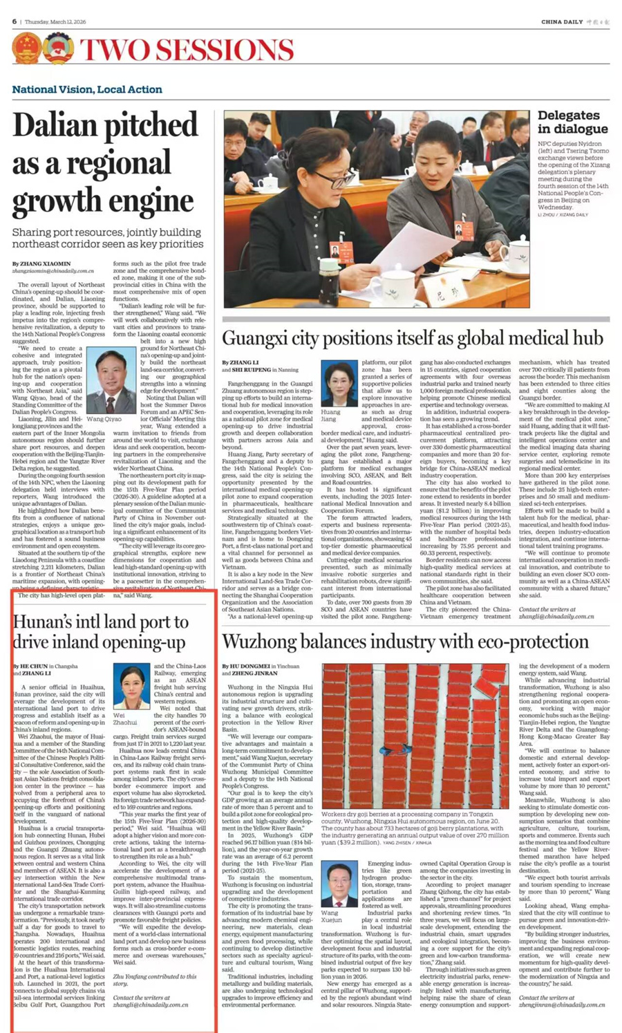編者按:《中國日?qǐng)?bào)》“中國式現(xiàn)代化的地方實(shí)踐”(National Vision, Local Action)高端訪談欄目,講述中國式現(xiàn)代化建設(shè)道路上的地方特色實(shí)踐。3月12日,《中國日?qǐng)?bào)》兩會(huì)專版刊發(fā)全國政協(xié)常委,懷化市委副書記、市長(zhǎng)韋朝暉專訪文章《Huaihua: Forging a New Highland for High-Level Opening-Up in Inland China(以國際陸港建設(shè)為引擎 奮力打造內(nèi)陸地區(qū)改革開放高地標(biāo)志性工程)》。