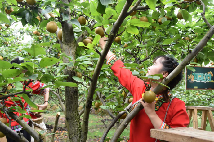 2019年8月22日,在靖州渠陽鎮(zhèn)林源村金秋梨基地的淘寶直播現(xiàn)場,身穿苗服的小阿妹現(xiàn)場摘梨、裝箱打包。