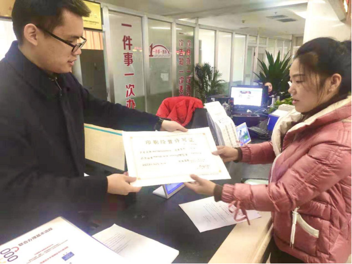 圖為“一件事一次辦”綜合窗口工作人員辦結(jié)柴女士申請辦理的我要開印刷企業(yè)(不含出版物類)事項后為其發(fā)放相關(guān)證件。