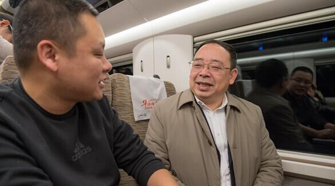 1月11日,省人大代表鐘果林在高鐵上接受懷化日報記者的采訪。(記者 潘雨 攝)