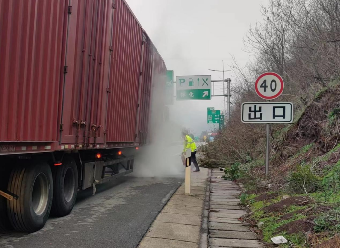 當(dāng)日下午,巡查人員黃海波、王銘荃駕車由懷化往吉首方向巡查,巡至南往北方向K2158+600(懷化服務(wù)區(qū)入口附近)時,發(fā)現(xiàn)前方行車道上一輛大貨車右前輪正冒著黑煙,且有刺鼻的輪胎燃燒的焦煳味,而該車駕駛?cè)撕敛恢椋择{車行駛,極易引發(fā)全車自燃事故。