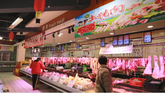 超市里,生鮮攤位前的市民們有序挑選著當天的豬肉產品,查看肥瘦,詢問部位和價格。工作人員則根據(jù)顧客需求切割、稱重。一片安心、祥和的民生圖景。